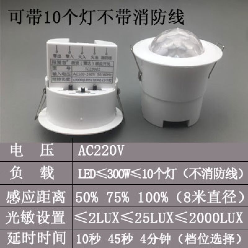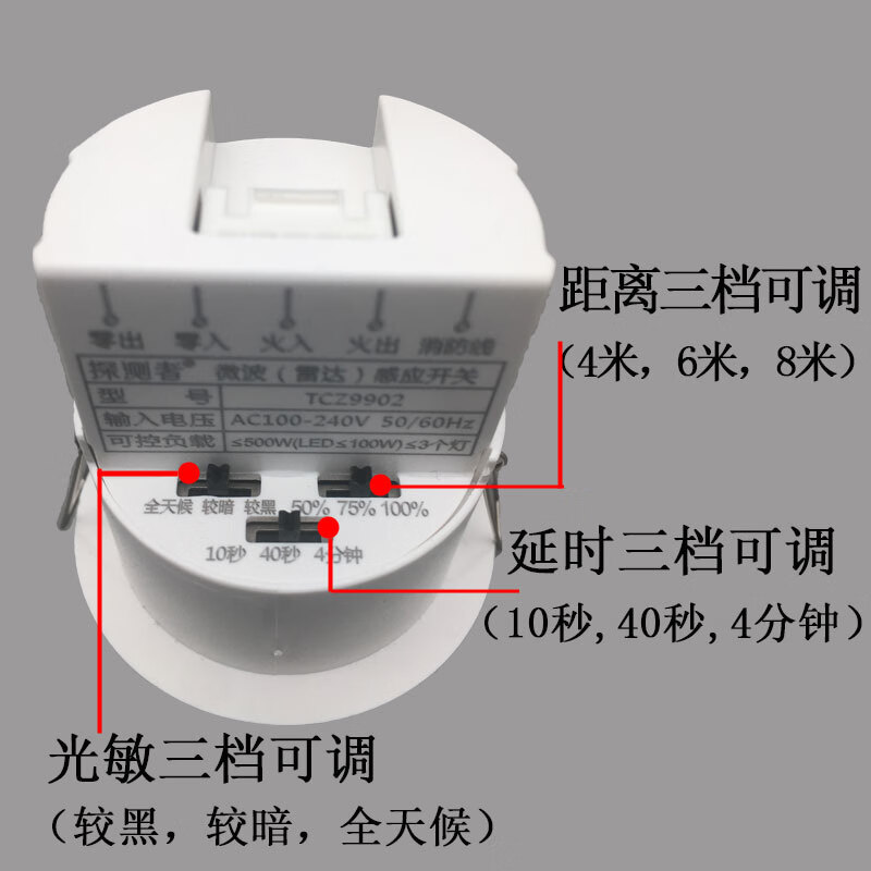 探测者/tancezhe 9902 感应开关 探测者220V微波雷达感应开关人体嵌入式可调探头模块控制器9902 不带消防线款